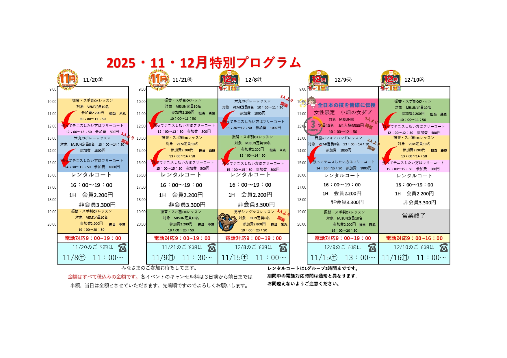 ご自分のペースで早く上達していただけます。 ✓ ラケット、シューズの無料レンタルがございますので手ぶらで始められます! ✓ 経験者クラスは地域最長の110分と充実のレッスン内容となっております。 ✓ インドアコートなので雨や紫外線を気にせず受講していただけます。 ✓ お得な新規ご入会特典も用意しております! まずは無料体験をお気軽に受けてみてください! |